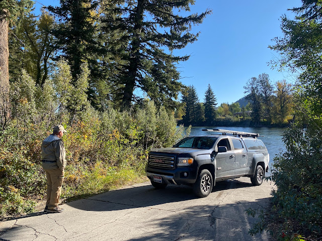 We unloaded the car and got settled. I gave dad the downstairs bedroom/bathroom and took the loft so he wouldn't have to climb stairs. Since we ate a late lunch, we grabbed a couple of deli sandwiches from the market and had those for dinner. We readied our gear for the morning, and I boiled some eggs for breakfast. Our meetup time was 8:00 am, and luckily we were less than 10 minutes from the rendezvous point. Our guide, Kevin from Worldcast Anglers, arrived right on time, and we had quick introduction before tossing our gear in his truck and heading for the launch point in the National Park. It was a crisp morning in the low 40's, but the forecast called for sunny skies and mid 70's temps, so I opted for shorts and upper body layers which I could unpeeled as the weather warmed. After getting our rigs set up with hopper-droppers, we launched and pulled up on the bank for a quick introduction on fishing from the boat. I sat in the back so dad could fish from the front, which is easier and gets first dibs on the fish. I probably could have just sat in the boat and watched him fish. He was so into it, focused. Of course he made some beginner mistakes, but Kevin was super patient and an excellent teacher. It wasn't long before dad caught his first cutthroat on the dropper, about a 15" fine spotted cutthroat which is actually a Yellowstone strain, but its color is adapted more for the environment of the Snake. He caught a few more trout and some whitefish. I caught a nice one under a cutbank on the dry. The scenery made it difficult to concentrate on fishing, and several times I just sat back with my rod stowed and enjoyed the view. I really appreciated Kevin because he understood this. I told him from the get-go that my priority was for my dad to learn and catch some fish and that if I took a break from fishing it wasn't because I wasn't enjoying myself, on the contrary, I wanted to soak it all in. He really got that.